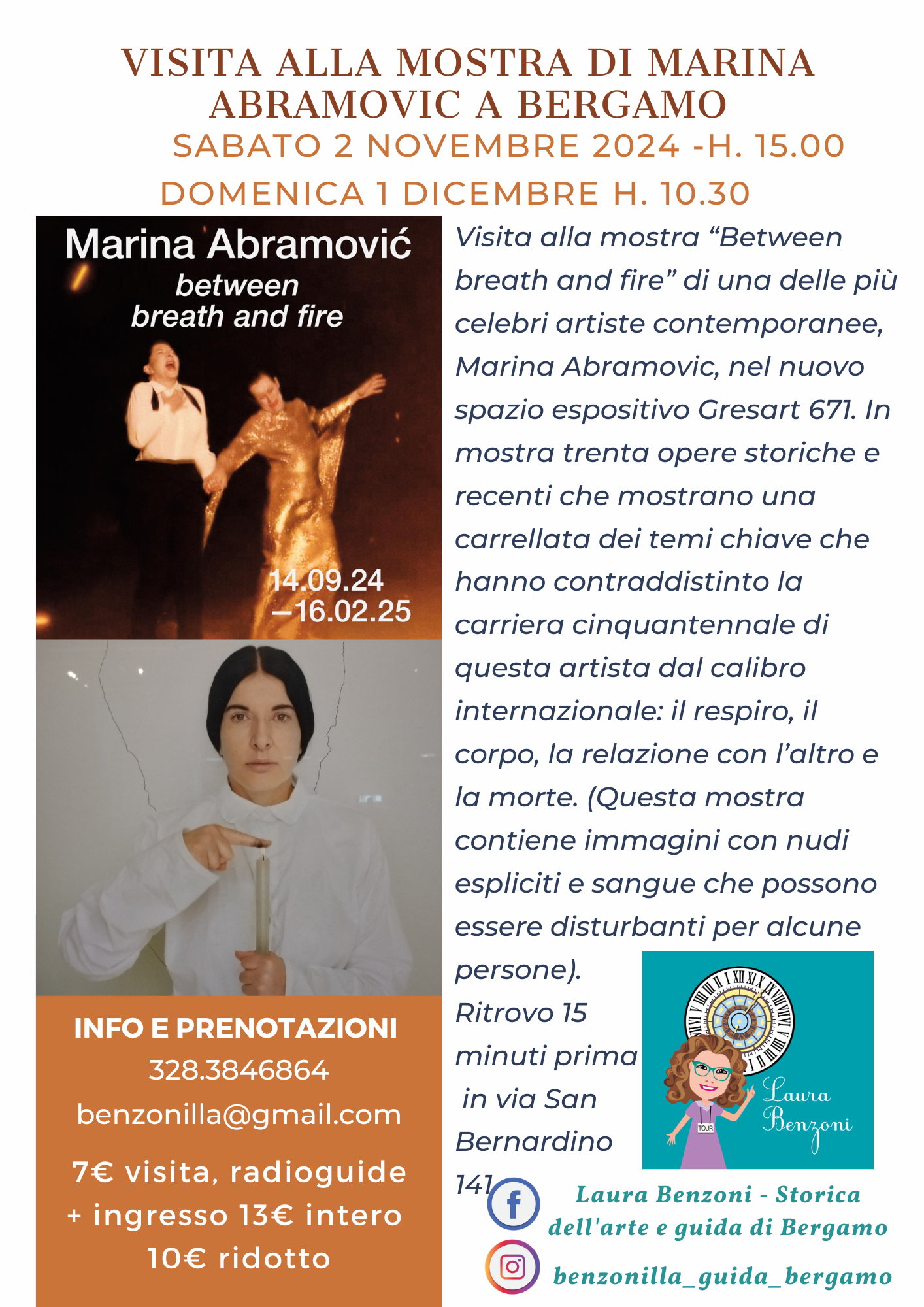 Con Laura Benzoni, il 2 novembre alle 15, ci sarà la possibilità di partecipare ad una visita guidata alla mostra “Between breath and fire”, di Marina Abramović, una delle più celebri artiste contemporanee. La mostra si tiene presso il nuovo spazio espositivo gres art 671, a Bergamo.