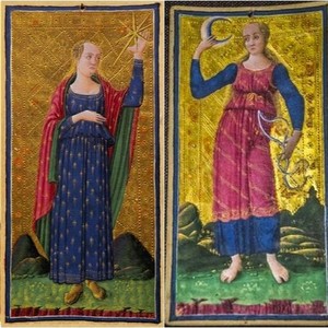 Nascono infatti nelle corti italiane del Quattrocento come raffinato gioco di carte. I primi mazzi erano preziosissimi, delle vere opere d’arte, come il Mazzo Colleoni, diviso tra l’Accademia Carrara, la Morgan Library di New York e una collezione privata, ma eccezionalmente riunito per questa mostra!