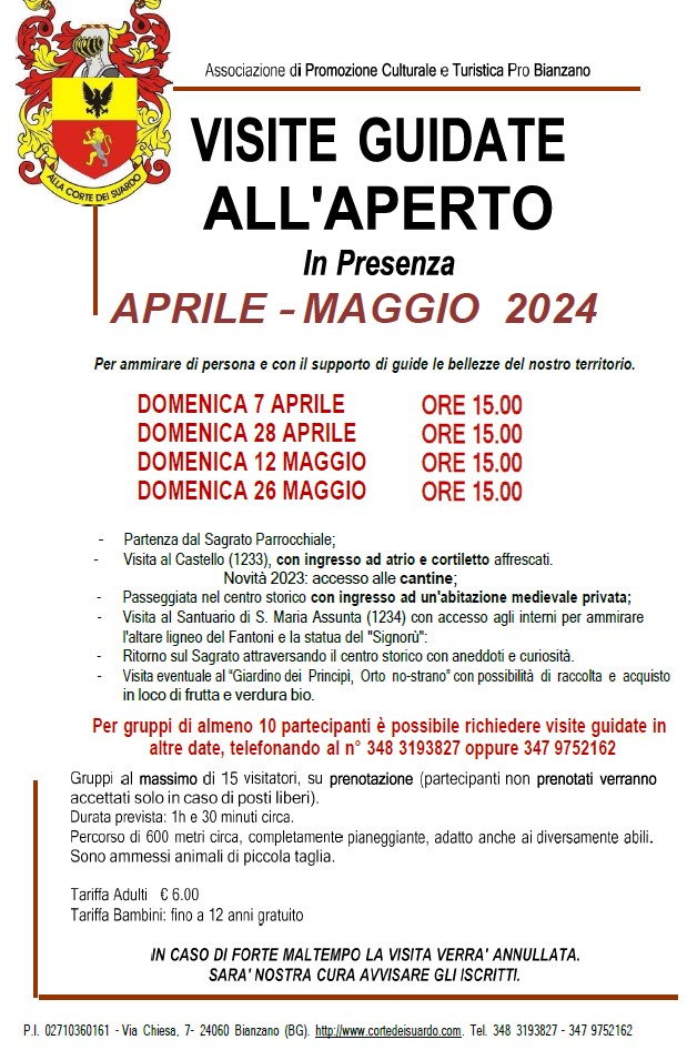A partire dal 7 aprile, l'Associazione Pro Bianzano organizza delle visite guidate con partenza dal Sagrato Parrocchiale. Si farà una visita al castello del 1233, con ingresso all'atrio e al cortiletto affrescati e, novità del 2023, accesso alle cantine.