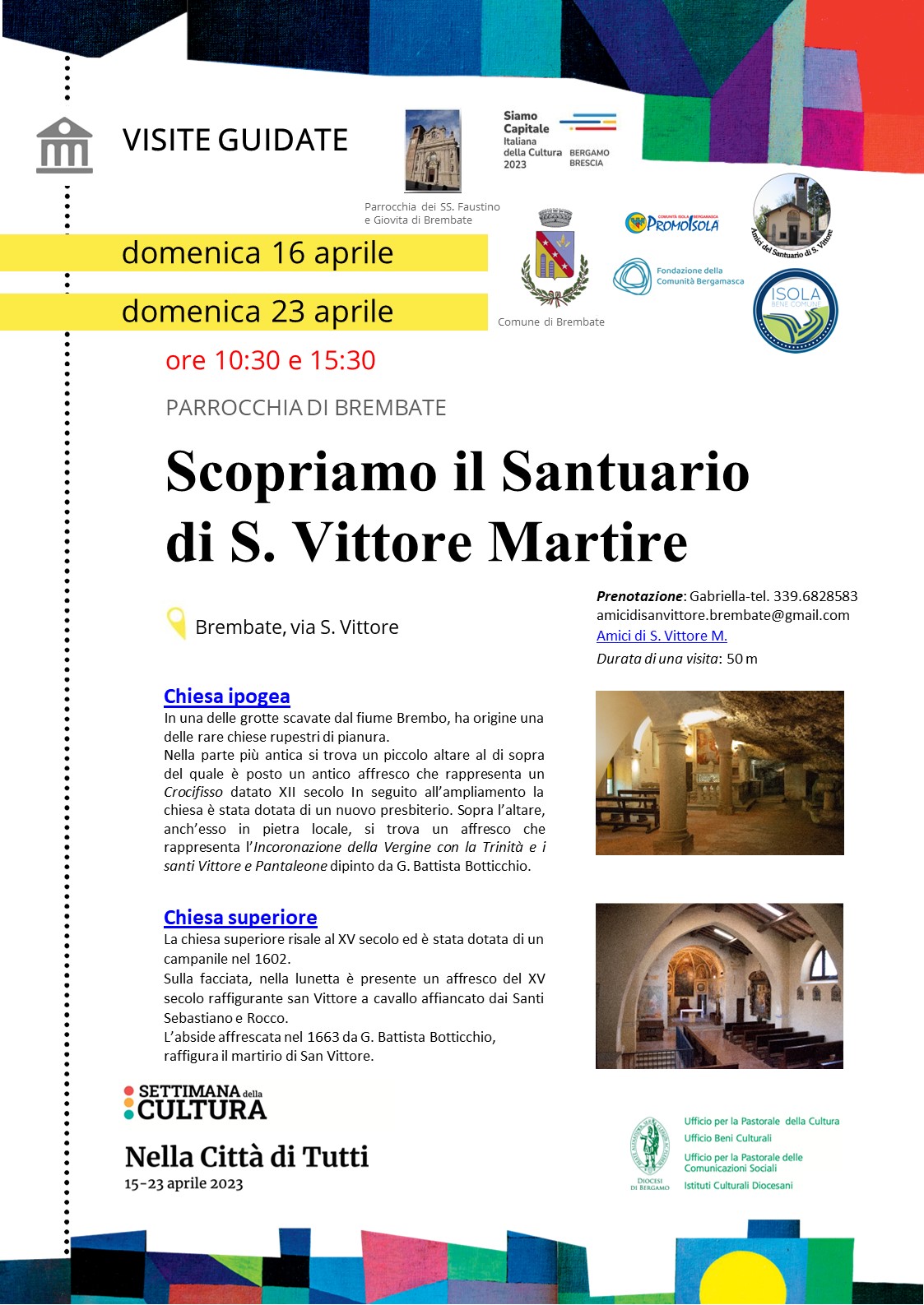 Un suggestivo itinerario alla scoperta del patrimonio storico e artistico custodito dalle chiese del territorio di Brembate Sotto. In programma visite guidate della medievale chiesa ipogea rupestre e della superiore chiesa di S. Vittore M. a cura dei volontari dellโassociazione Amici del Santuario di S. Vittore.