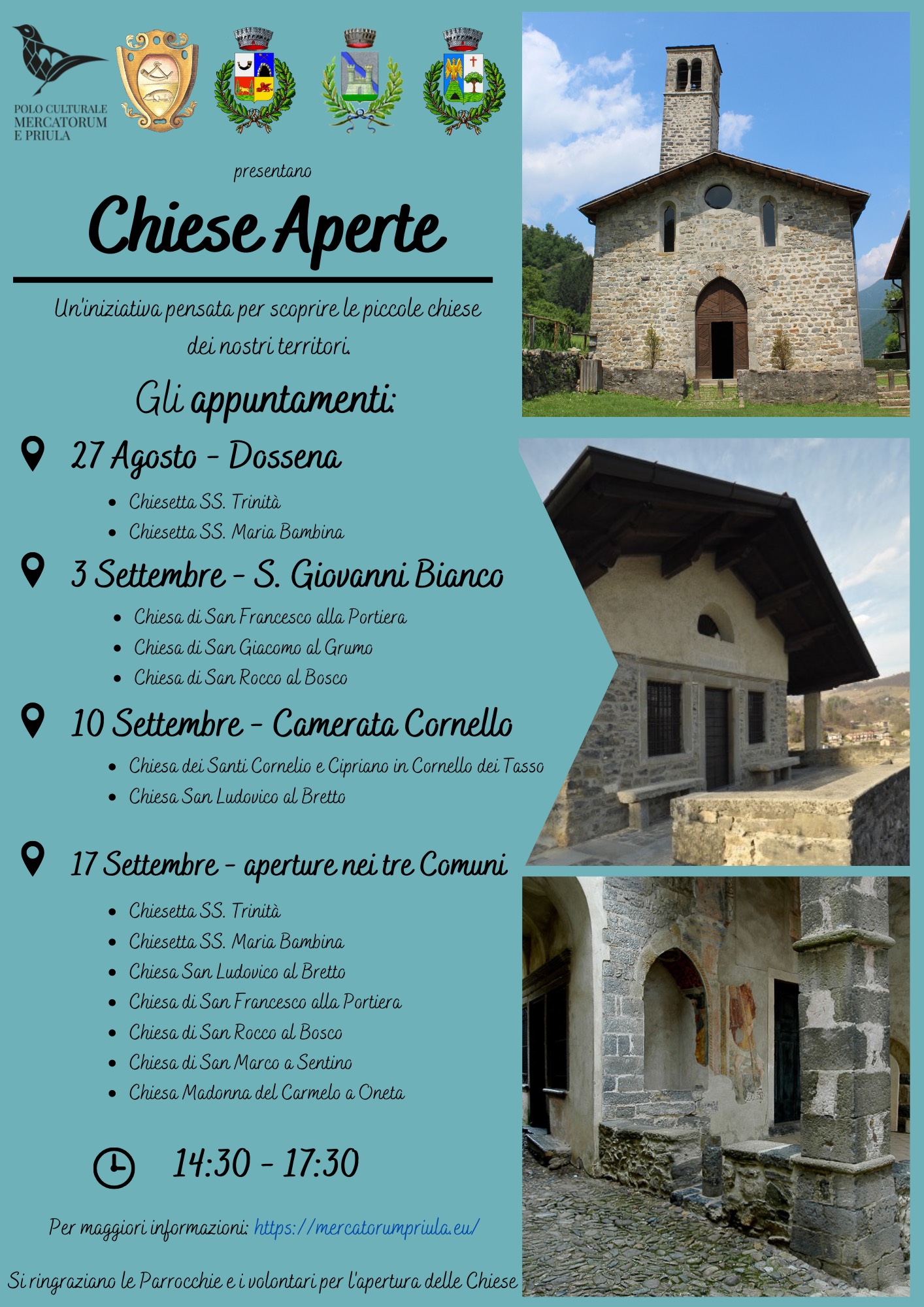 Il Polo Culturale “Mercatorum e Priula/vie di migranti, artisti, dei Tasso e di Arlecchino” organizza per il secondo anno consecutivo “Chiese Aperte”, un’iniziativa pensata per riaprire le piccole chiese site nei territori di Camerata Cornello, Dossena e San Giovanni Bianco.