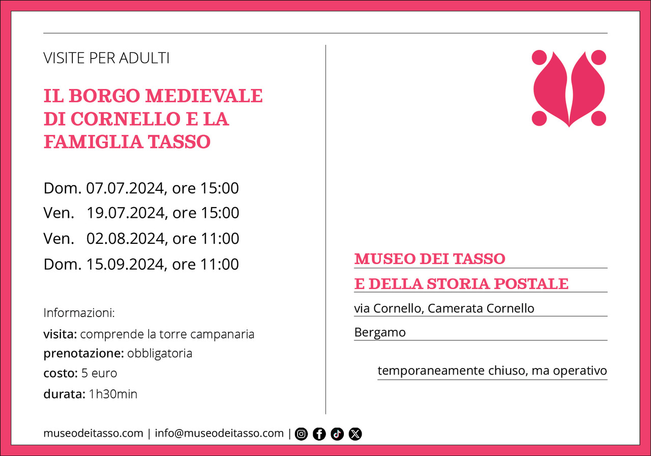 Un’occasione per scoprire il borgo di Cornello dei Tasso, luogo d’origine della famiglia Tasso, nota in tutto il mondo per l'opera letteraria di Torquato Tasso e per l'abilità imprenditoriale di alcuni suoi esponenti, che fondarono e gestirono per secoli il servizio postale europeo.