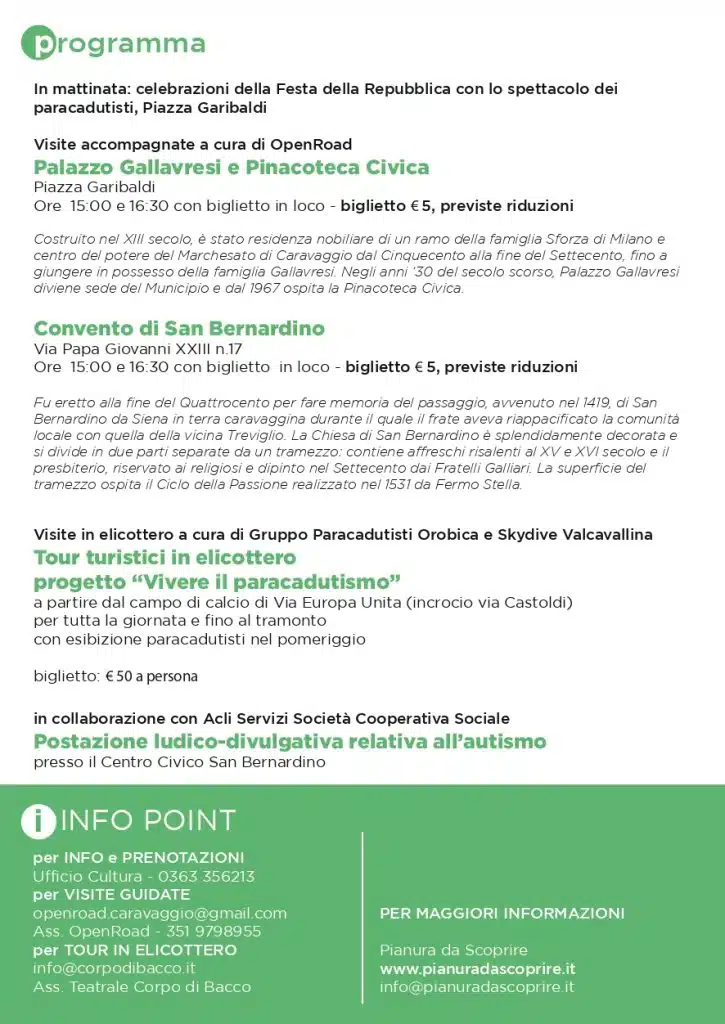 L’associazione Pianura da Scoprire, insieme al Comune di Caravaggio e in collaborazione con l’Associazione OpenRoad, Skydive Valcavallina e il Gruppo paracadutisti orobico, vi invitano a partecipare alla giornata dedicata ai "Tesori della Media Pianura Lombarda".