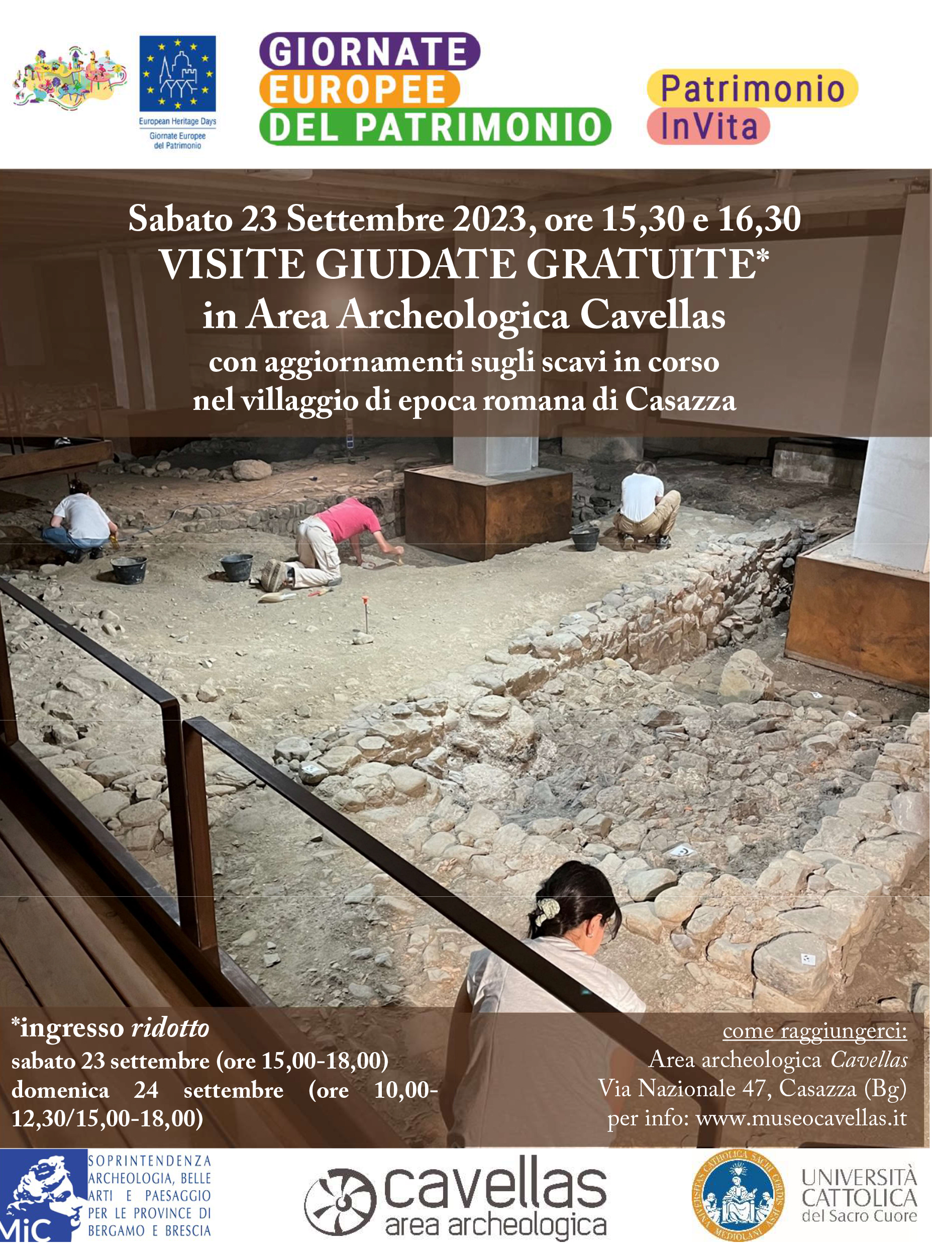 In occasione delle Giornate Europee del Patrimonio, sabato 23 e domenica 24 settembre l'ingresso all'area archeologica Cavellas, in via Nazionale 47 a Casazza, sarร ridotto a 2 euro (gratuito per i bambini sotto i 10 anni). Sabato 23 settembre, alle ore 15.30 e alle ore 16.30, sarร possibile partecipare gratuitamente ad una visita guidata ai resti dell'insediamento di etร romana, con le novitร dal cantiere di scavo in corso.