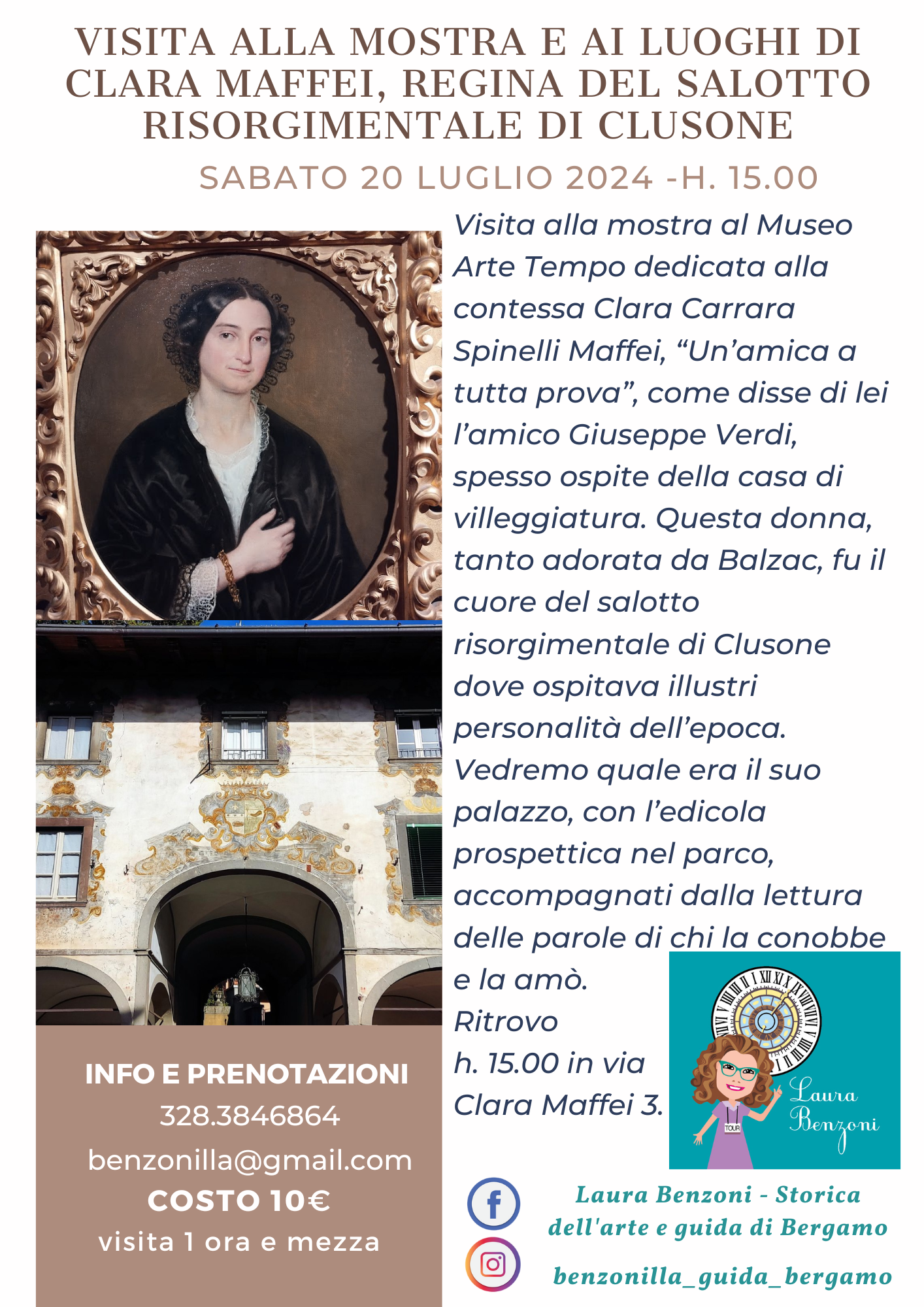 Visita alla mostra al Museo Arte Tempo dedicata alla contessa Clara Carrara Spinelli Maffei, “Un’amica a tutta prova”, come disse di lei l’amico Giuseppe Verdi, spesso ospite della casa di villeggiatura. Questa donna, tanto adorata da Balzac, fu il cuore del salotto risorgimentale di Clusone dove ospitava illustri personalità dell’epoca.