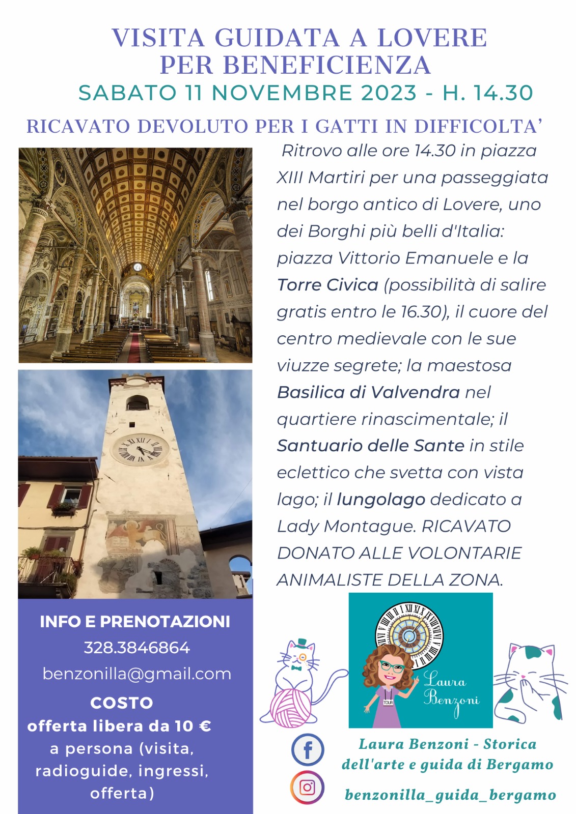 La storica dell'arte e guida di Bergamo Laura Benzoni, organizza una giornata di visite guidate per il centro medievale e le viuzze segrete di Lovere, dove il ricavato verrร devoluto in beneficenza ai i gatti in difficoltร .! Contribuiamo con la Bellezza ad aiutare i piรน sfortunati, facendo del bene ai mici di nessuno.