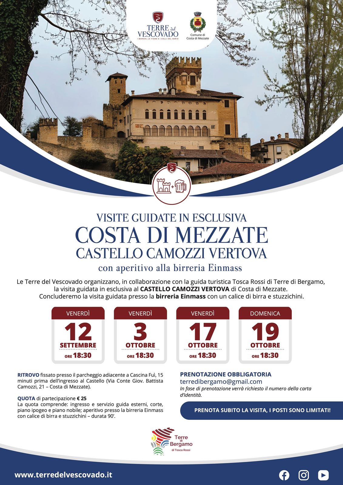 Le Terre del Vescovado organizzano, in collaborazione con la guida turistica Tosca Rossi di Terre di Bergamo, la visita guidata in esclusiva al CASTELLO CAMOZZI VERTOVA di Costa di Mezzate. Concluderemo la visita guidata presso la birreria Einmass con un calice di birra e stuzzichini.