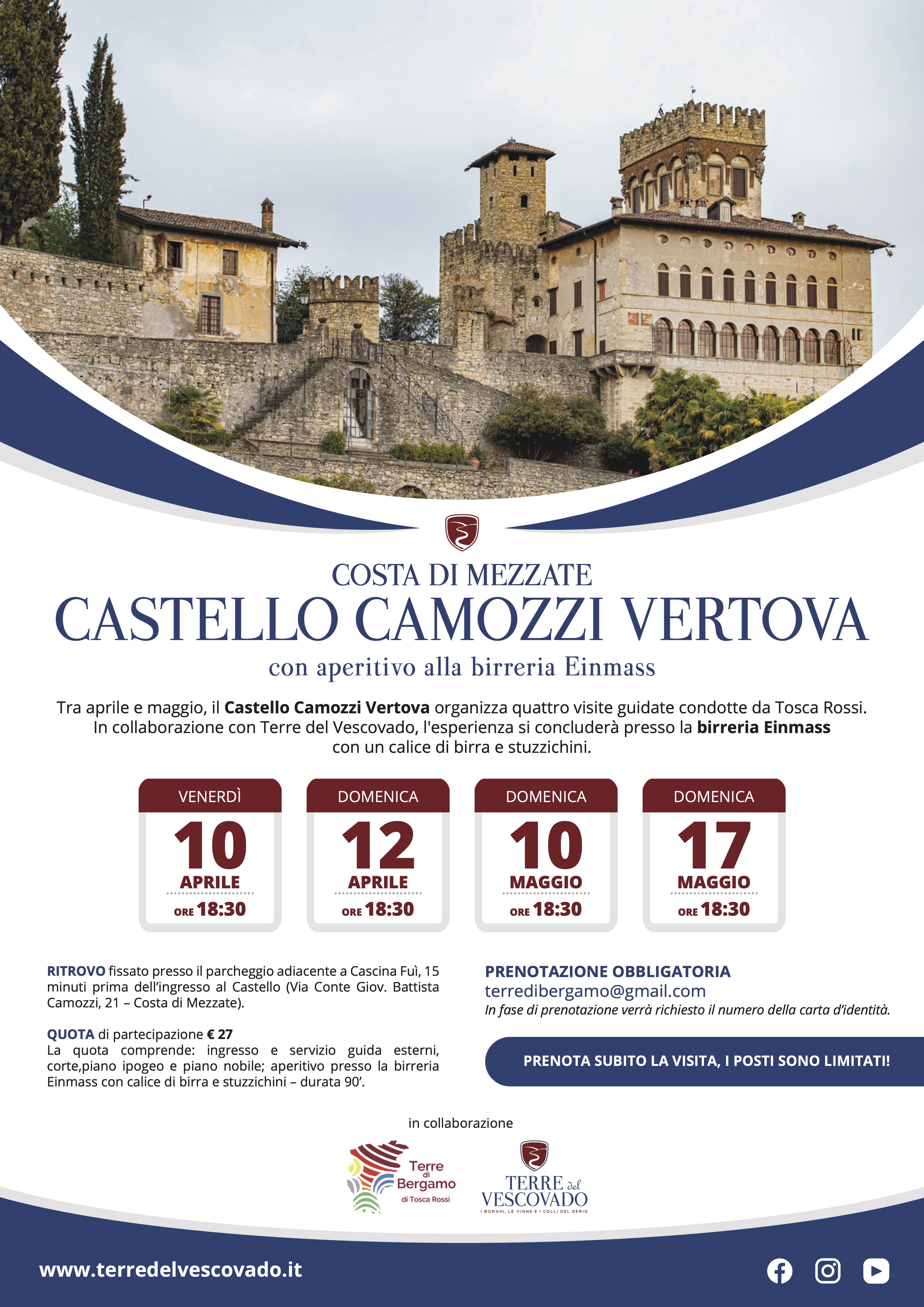 Tra aprile e maggio, il Castello Camozzi Vertova organizza quattro visite guidate condotte da Tosca Rossi. In collaborazione con Terre del Vescovado, l'esperienza si concluderร presso la birreria Einmass con un calice di birra e stuzzichini.