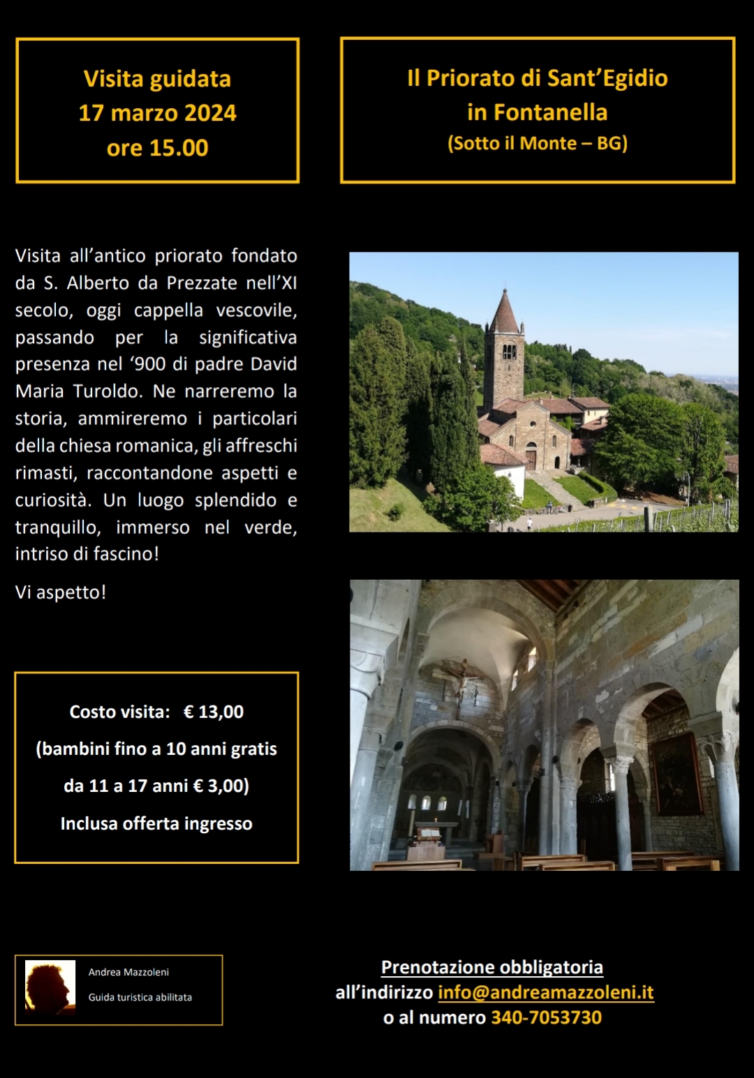 Visita all’antico priorato fondato da S. Alberto da Prezzate nell’XI secolo, oggi cappella vescovile, passando per la significativa presenza nel ‘900 di padre David Maria Turoldo. Ammirerete i particolari della chiesa romanica, gli affreschi rimasti, raccontandone aspetti e curiosità. Un luogo splendido e tranquillo, immerso nel verde, intriso di fascino!