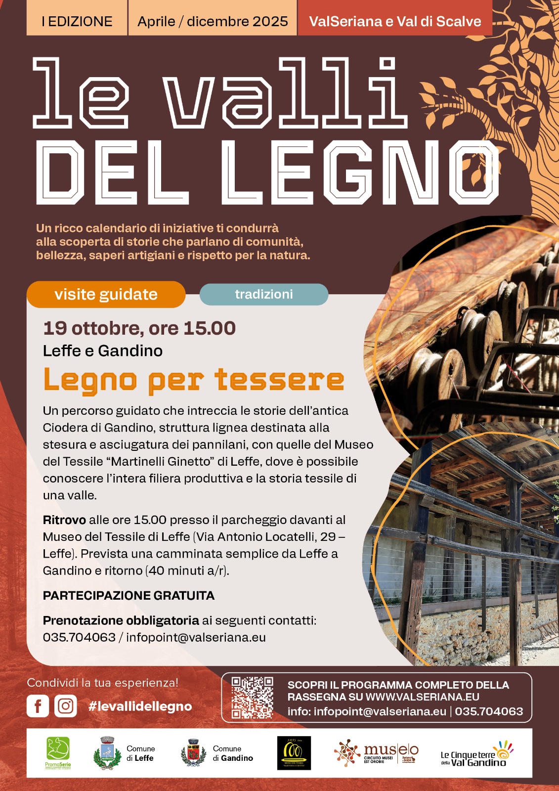 Un viaggio tra natura e saperi artigiani delle Valli Seriana e Scalve. Un percorso guidato che intreccia le storie dell’antica Ciödera di Gandino, struttura lignea dedicata alla stesura e asciugatura dei pannilani, e quelle del Museo del Tessile.