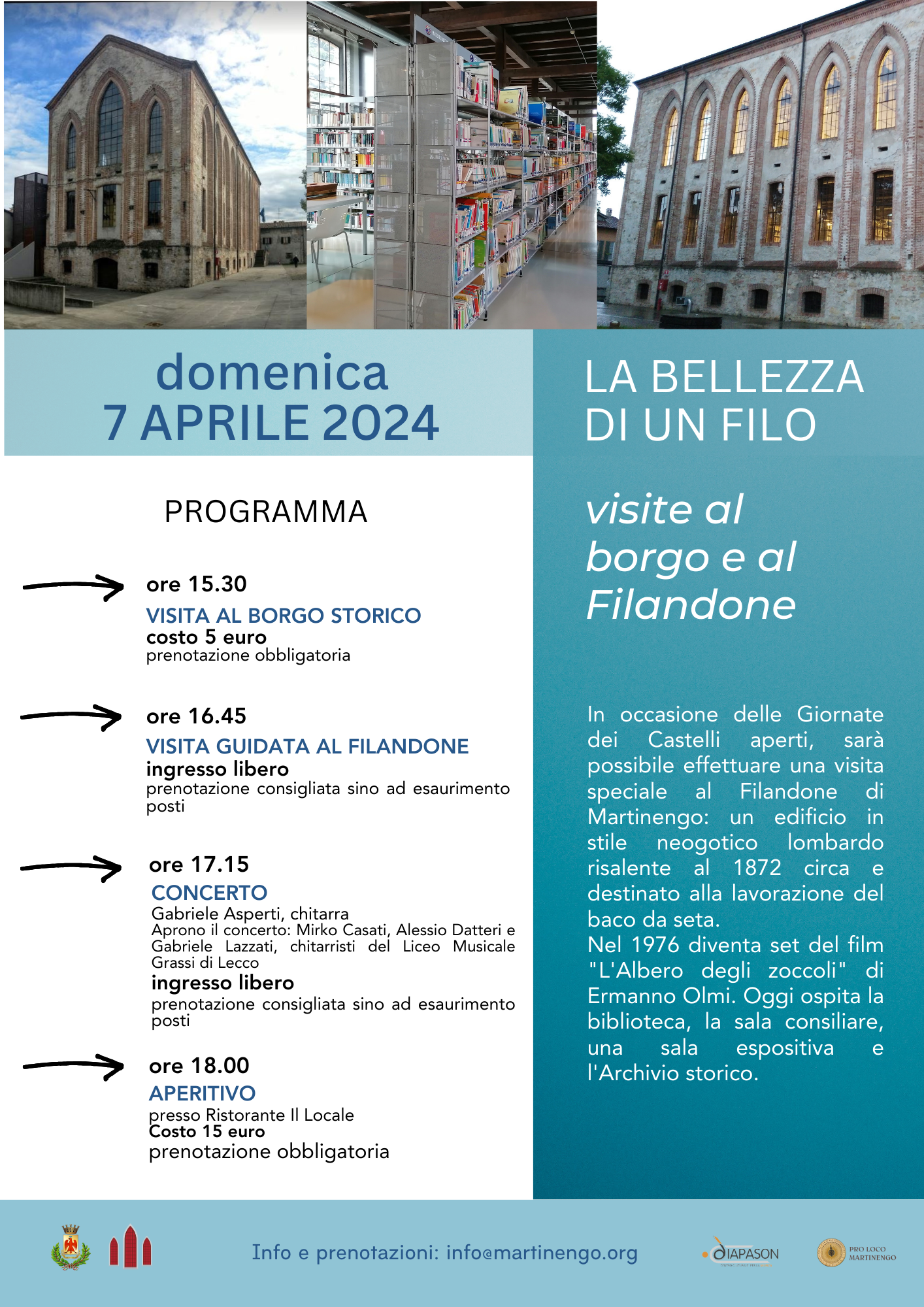 - ore 16.45: Visita guidata al Filandone. Ingresso libero. Prenotazione consigliata fino ad esaurimento posti