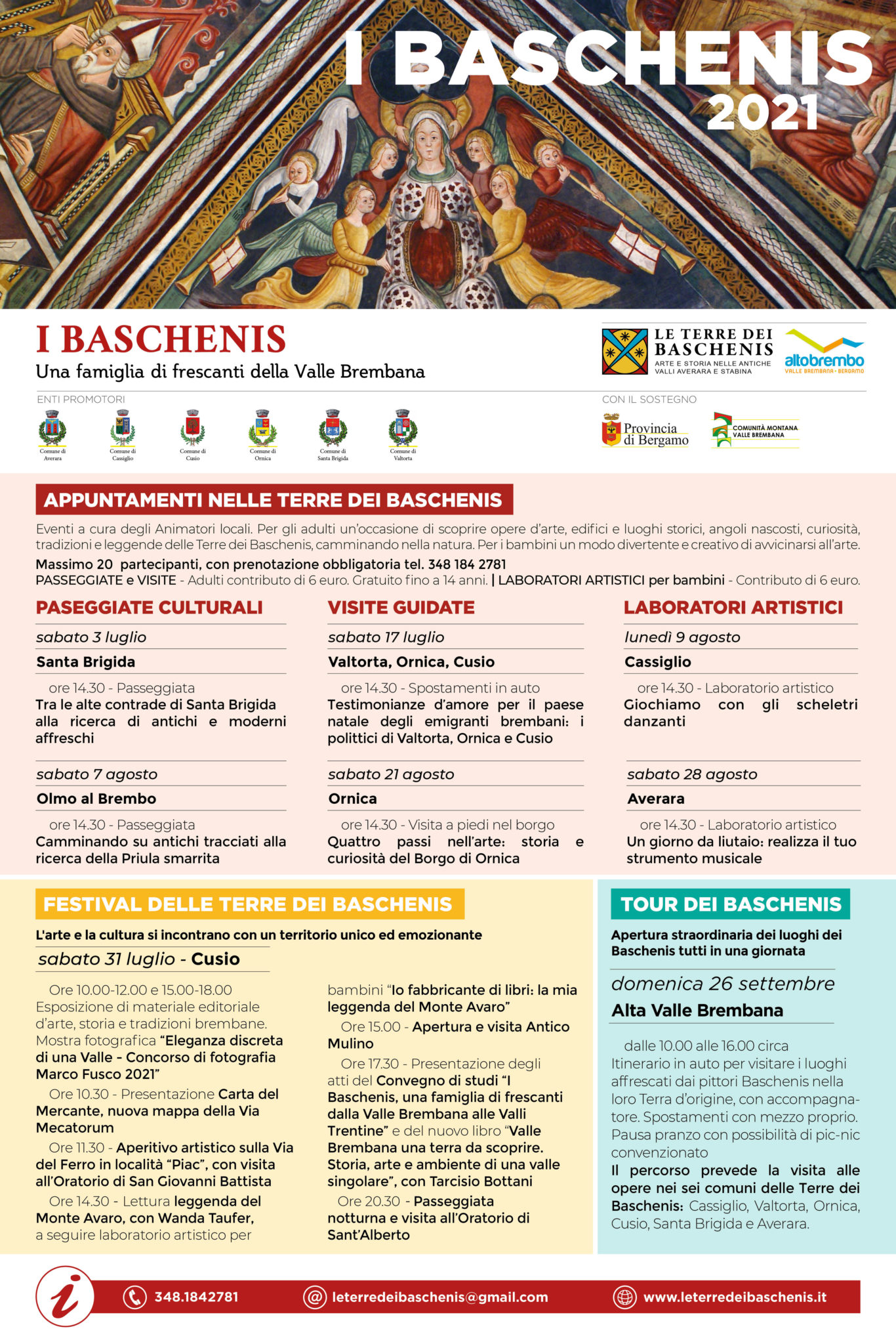 Itinerario in auto (con mezzo proprio) per visitare i luoghi affrescati dai pittori Baschenis nella loro Terra d’origine, a cura degli Animatori locali. Per gli adulti un’occasione di scoprire opere d’arte, edifici e luoghi storici, angoli nascosti, curiosità, tradizioni e leggende delle Terre dei Baschenis, per i bambini un modo divertente e creativo di avvicinarsi all’arte.