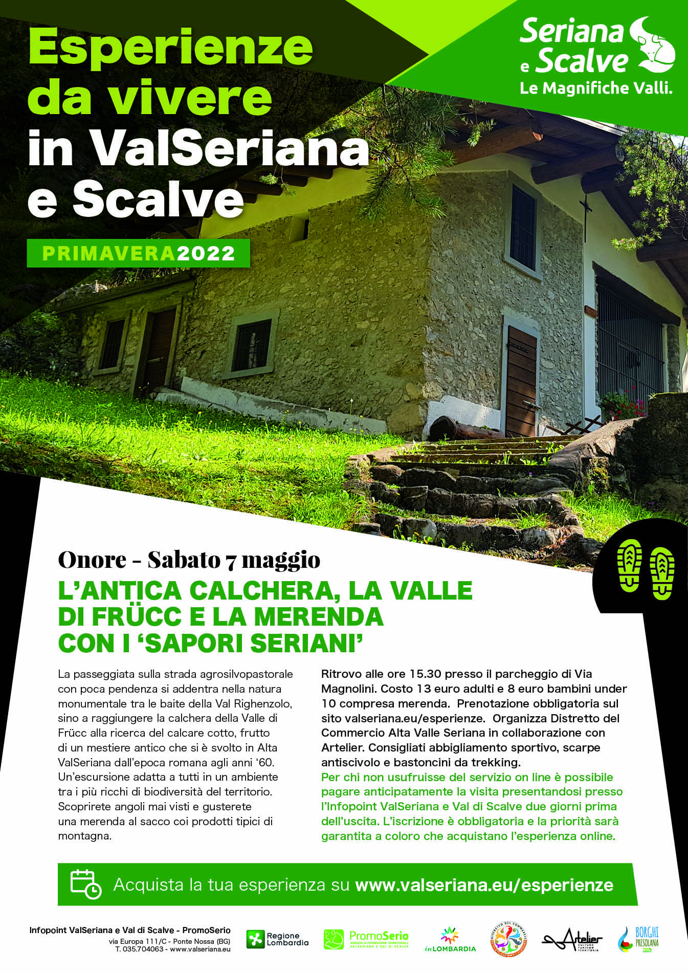 La passeggiata sulla strada agrosilvopastorale con poca pendenza si addentra nella natura monumentale tra le baite della Val Righenzolo, sino a raggiungere la calchera della Valle di Frücc alla ricerca del calcare cotto, frutto di un mestiere antico che si è svolto in Alta Valeriana dall’epoca romana agli anni ’60. Un escursione adatta a tutti in un ambiente tra i più ricchi di biodiversità del territorio.