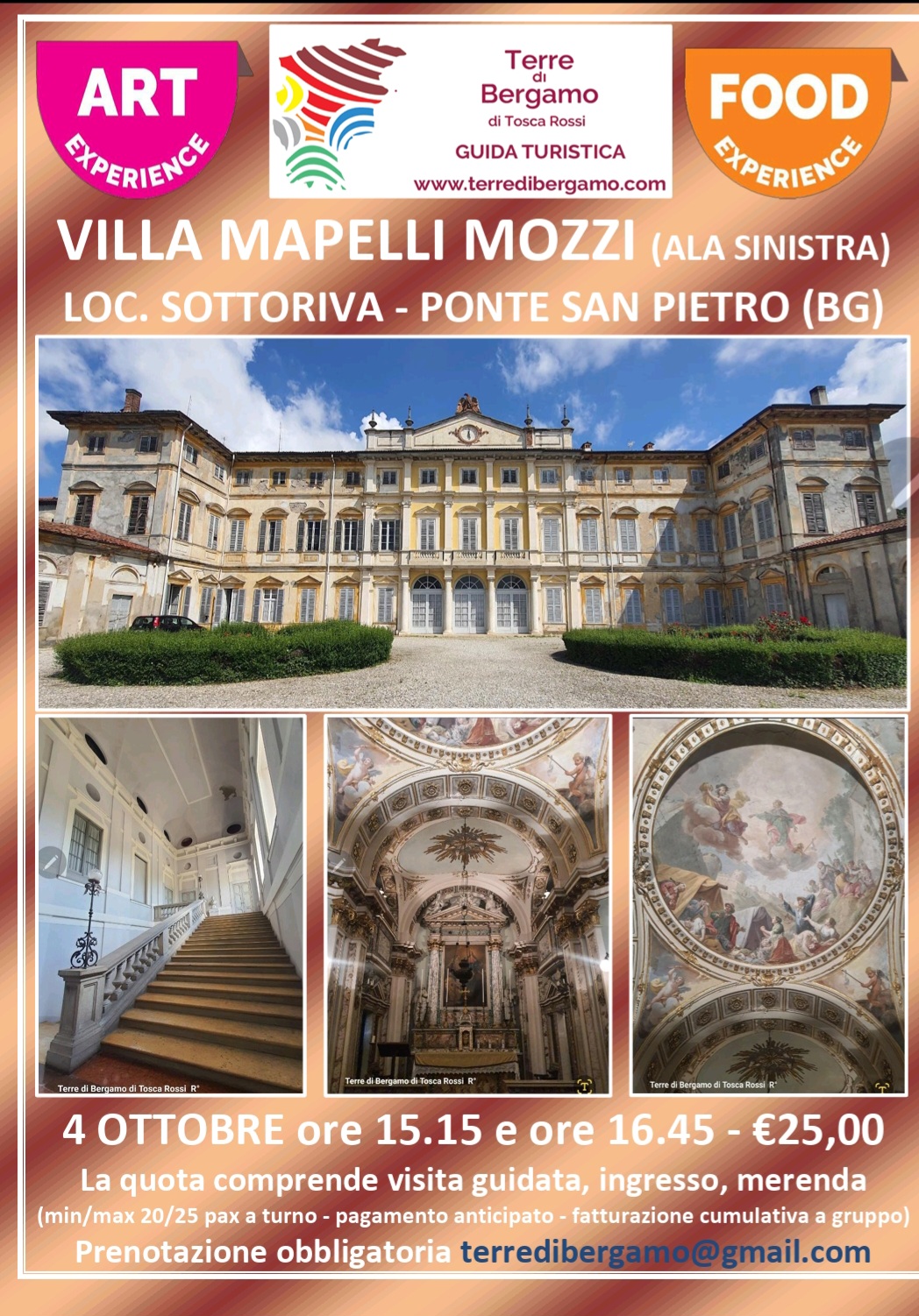 Visita guidata della villa (ala sinistra) con accesso a scalone, locali interni, sacrestia, cappella di famiglia e parco. In base al turno di visita scelto a seguire o in arrivo calice di vino con stuzzichini.