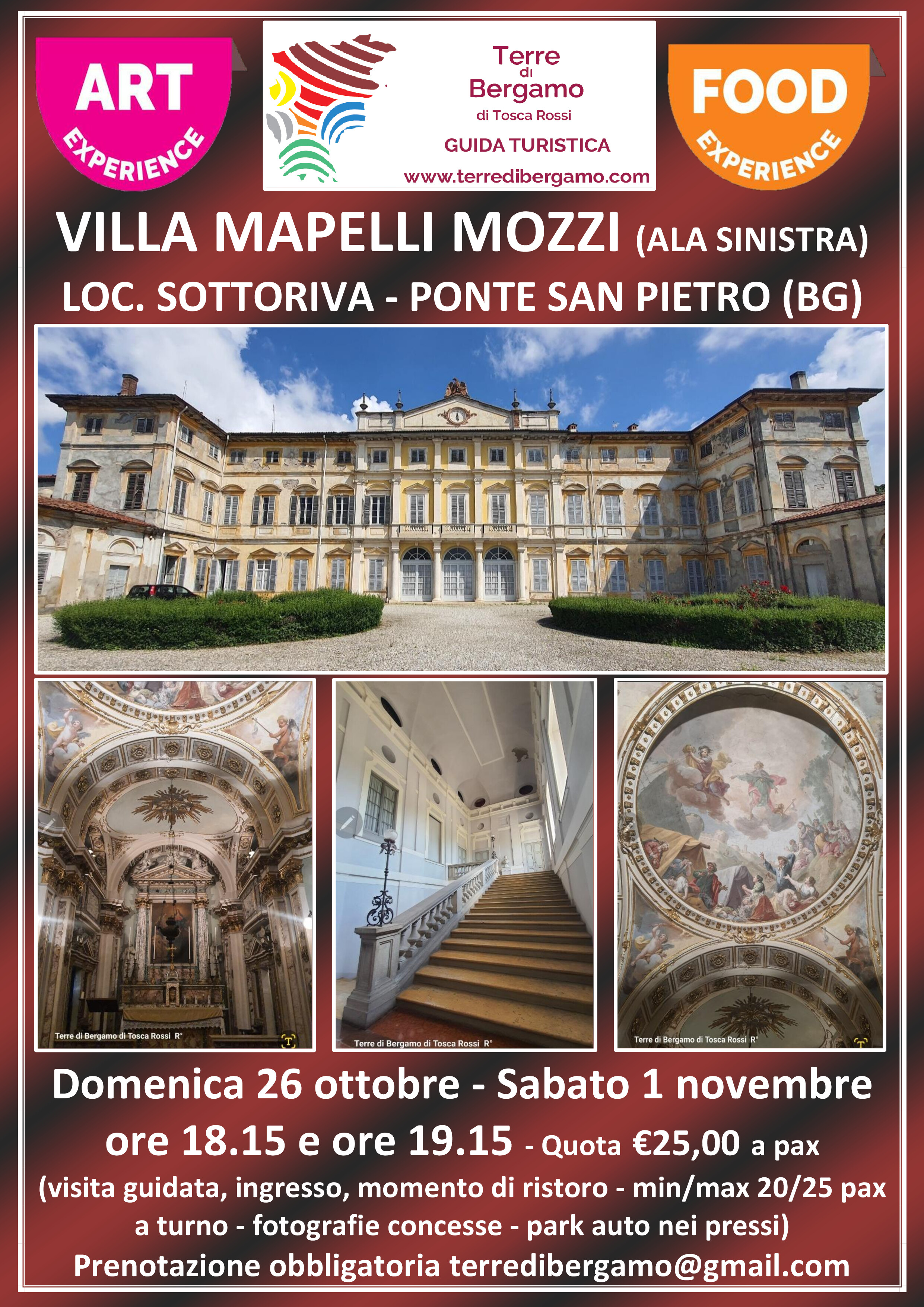 Visita guidata della villa (ala sinistra) con accesso a scalone, locali interni, sacrestia, cappella di famiglia e parco. In base al turno di visita scelto a seguire o in arrivo calice di vino con stuzzichini.