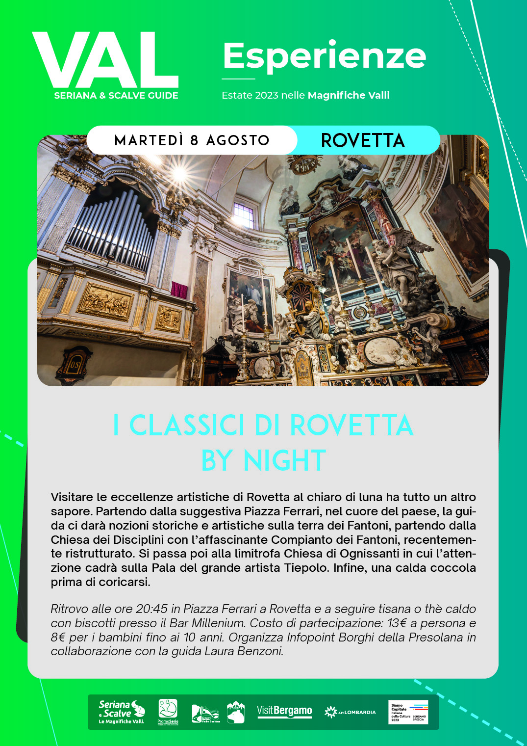 Visitare le eccellenze artistiche di Rovetta al chiaro di luna ha tutto un altro sapore. Partendo dalla suggestiva Piazza Ferrari, nel cuore del paese, la guida ci darà nozioni storiche e artistiche sulla terra dei Fantoni, partendo dalla Chiesa dei Disciplini con l’affascinante Compianto dei Fantoni, recentemente ristrutturato. Si passa poi alla limitrofa Chiesa di Ognissanti in cui l’attenzione cadrà sulla Pala del grande artista Tiepolo. Infine, una calda coccola prima di coricarsi.