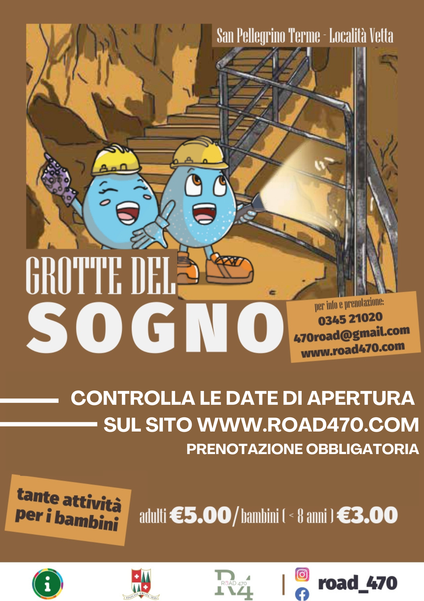 Road 470 propone visite guidate presso le Grotte del Sogno di San Pellegrino Terme, in localitร Vetta. Queste grotte sono state le prime grotte valorizzate turisticamente in Lombardia.