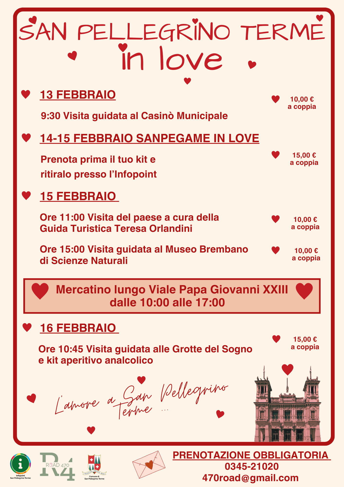 Arriva San Valentino a San Pellegrino Terme! Nel weekend tante attività pensate su misura per le coppie. Giovedì 13 febbraio è in programma una visita guidata al Casinò Municipale.