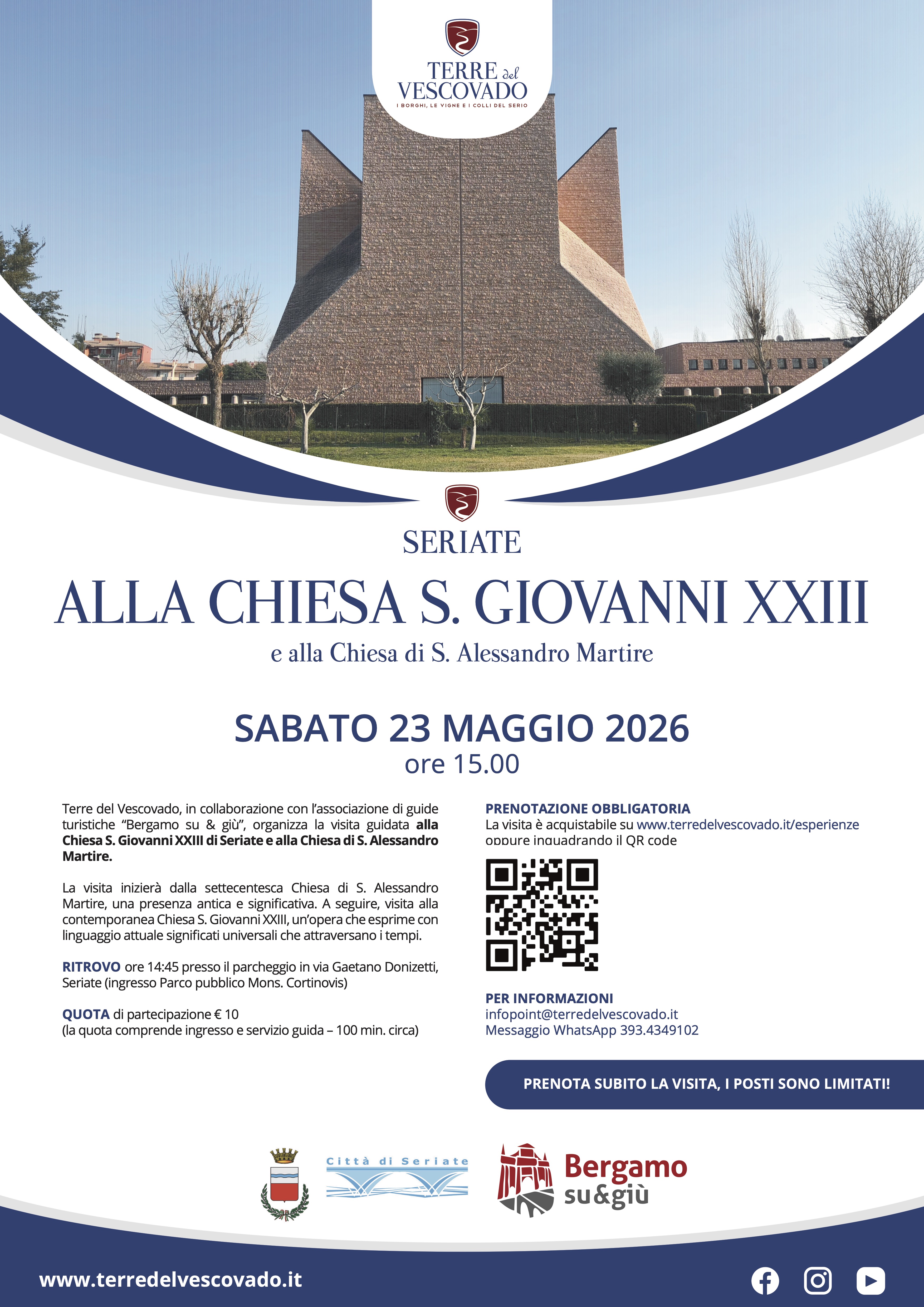 Terre del Vescovado, in collaborazione con lโassociazione di guide turistiche โBergamo su & giรนโ, organizza la visita guidata alla Chiesa S. Giovanni XXIII di Seriate e alla Chiesa di S. Alessandro Martire.