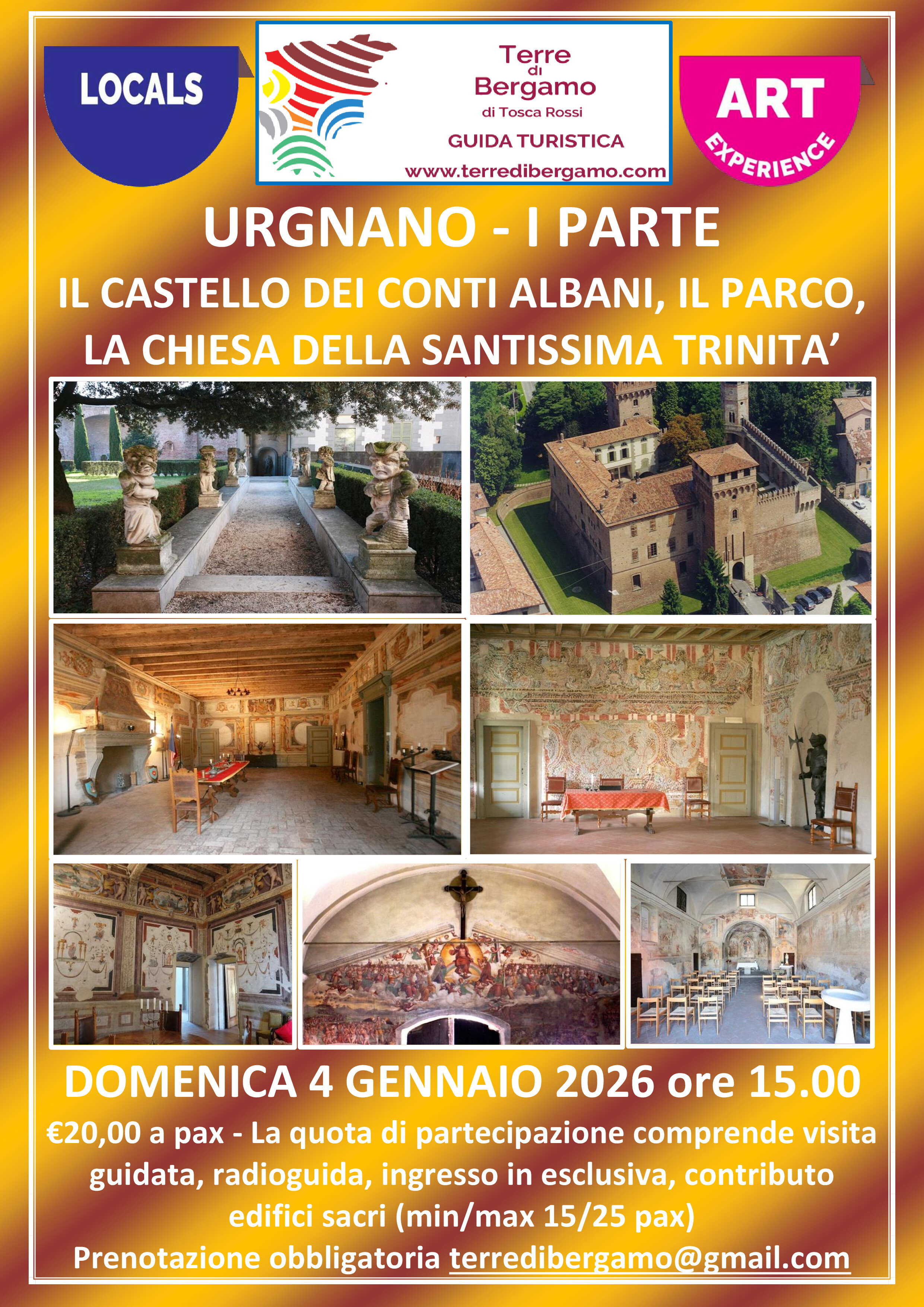 Accesso in esclusiva e visita di interni, torre, salita ai camminamenti, corte, palazzetto su 2 livelli con affreschi, giardino con grottesche, scalone monumentale. A seguire visita della chiesetta della SS Trinità con affreschi bascheniani e considerata la quarta cappella sistina bergamasca.