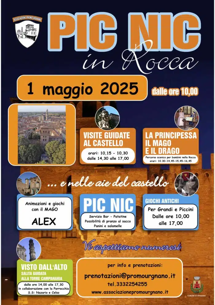 L’Associazione Promo Urgnano vi invita a trascorrere una giornata all’insegna della storia, del divertimento e della convivialità con l’atteso Pic Nic in Rocca. Un’occasione speciale per vivere la splendida Rocca Albani e il borgo di Urgnano in un’atmosfera rilassata e festosa. Durante la giornata, sarà possibile partecipare a visite guidate alla Rocca e al centro storico, immergendosi nelle affascinanti storie e leggende che animano questo luogo unico. I più piccoli (e non solo!) saranno incantati dallo spettacolo del Mago Alex, mentre giochi antichi e intrattenimenti all’aperto coinvolgeranno tutta la famiglia, tra risate e momenti di condivisione. E per chi desidera godersi una pausa gustosa all’aria aperta, le aie della Rocca si trasformeranno in un’area picnic con servizio bar, panini, salamelle e patatine per tutti i gusti.