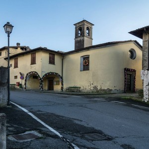 La chiesa edificata a partire dal XV secolo, presenta all’esterno un andamento non lineare. La facciata rivolta a lago è posta sulla via Valeriana, possiede un semplice portale e la finestra tonda; un angolo è smussato forse proprio per questioni di viabilità. Sul lato nord, a ridosso dell’ingresso laterale, vi è un porticato di una sola campata.