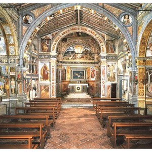 Nei sottarchi della navata sono raffigurati le Sibille e i Profeti. I 99 dipinti di cui è adornato l’interno sono opera di Gerolamo Colleoni (1500 – 1570), di Cristoforo Baschenis Il Vecchio (1520 – 1613) e di un autore ignoto (Certo T.L.) del 1600. Anche la facciata esterna era ricoperta di affreschi che, nel 1967, sono stati staccati per sottrarli alla rovina completa e attualmente sono collocati nella sagrestia della Chiesa Parrocchiale.