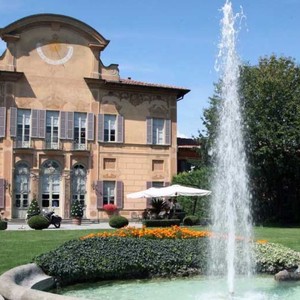 Nel lungo prospetto simmetrico la residenza padronale, collocata al centro, assume il giusto risalto sia nella definizione architettonica sia nella volumetria: si tratta di un edificio a pianta quadrata a due piani che si affaccia sul più tardo giardino all’inglese. Il fronte è tripartito da lesene e la campata centrale si differenzia sia per l’alto timpano curvilineo sia per la serrata disposizione delle strette e alte aperture, al piano terra, con terminazione ad arco ricavate in spessore di muro e al primo piano con gli elaborati balconcini rococò in ferro battuto. Filtra l’accesso al grande salone terreno un atrio che era affiancato lateralmente da due rampe di scale speculari, in pietra di Sarnico, che salivano al piano nobile (lo scalone di sinistra è stato eliminato agli inizi del secolo XIX).