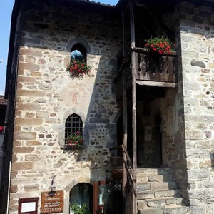 Specialità bergamasche e vini nelle 2 intime sale di un locale rustico con tavoli esterni sotto un portico.