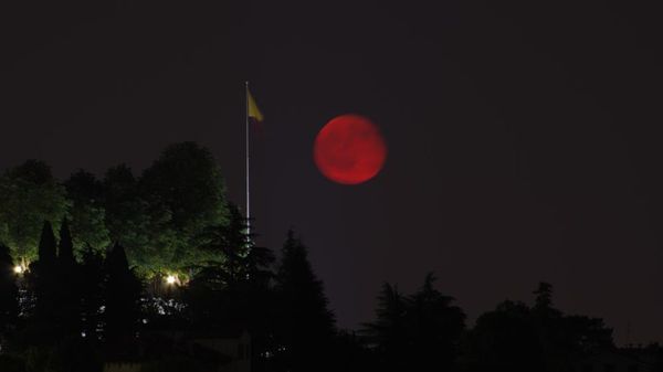 La luna rossa splende nel cielo di Bergamo