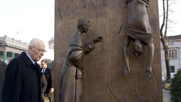 Il Presidente Napolitano davanti al monumento al partigiano di Giacono Manzù