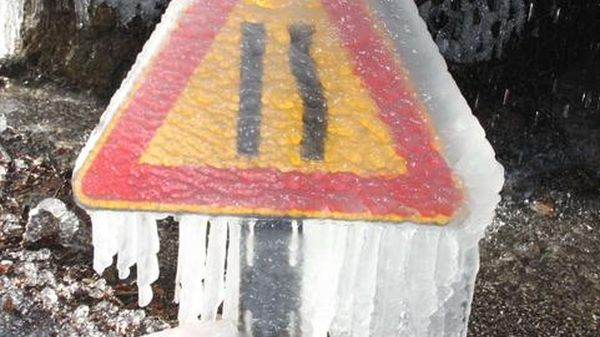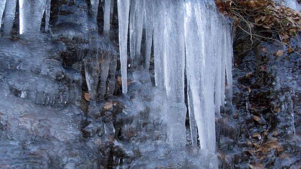Freddo polare: in montagna stalattiti di ghiaccio sulle pareti di roccia