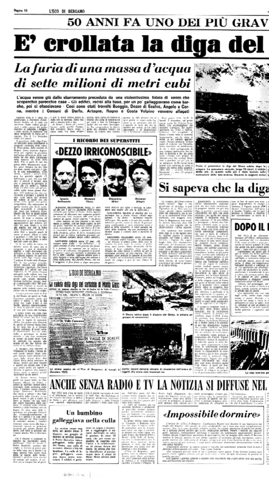 Le prime pagine del giornale, le foto d’epoca che hanno testimoniato il disastro di cent’anni fa e una pagina in ricordo dei 50 anni del crollo.