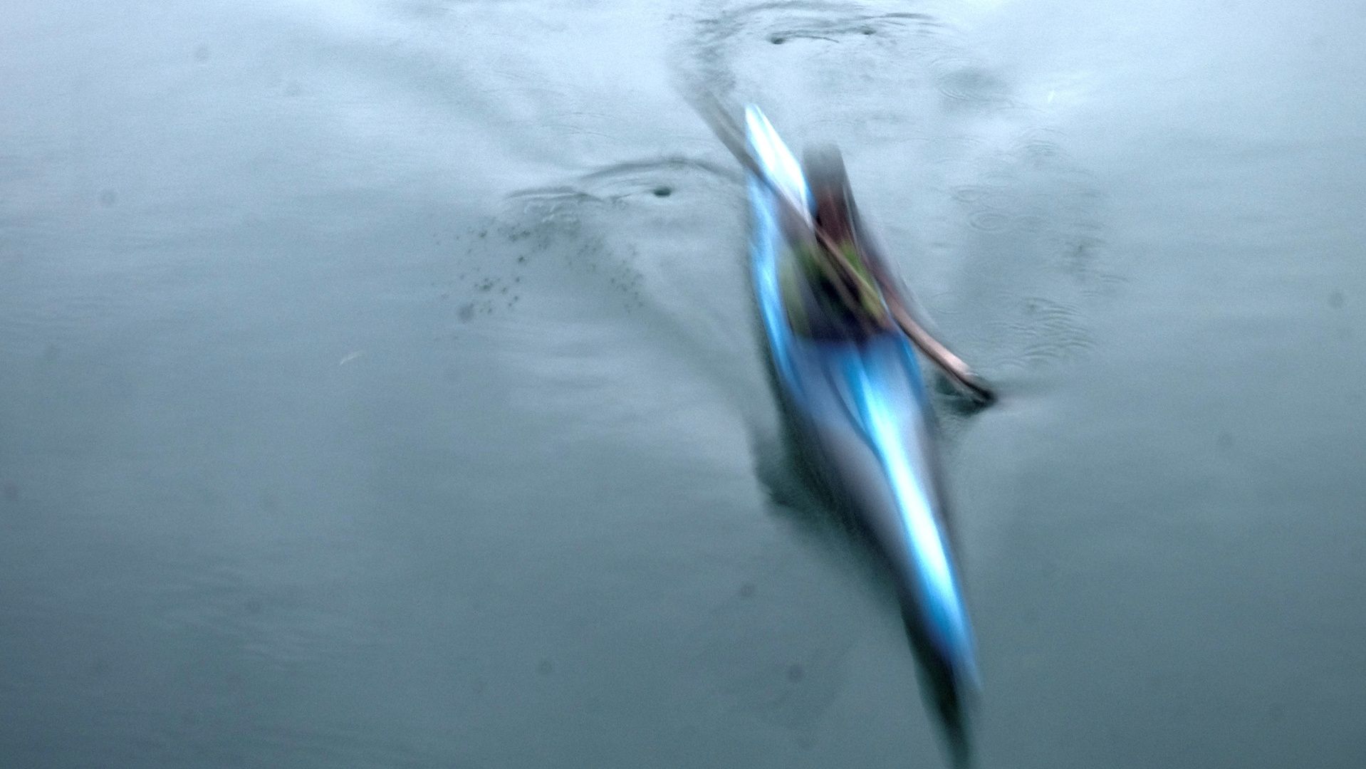 L’immagine realizzata da Rundolph Carter dal ponte Paratico–Sarnico, mostra un kayak che muove le acque apparentemente immobili del lago.