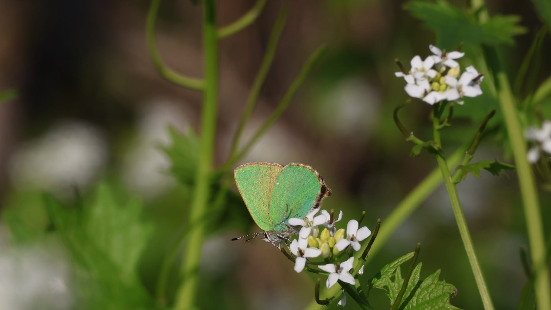 Ad aprile ha cominciato a volare la farfalla Tecla del rovo, una licenide dalle ali verde mare che la fanno mimetizzare tra i rovi e l’erba alta. Lo scatto di Costanzo Spizzi.