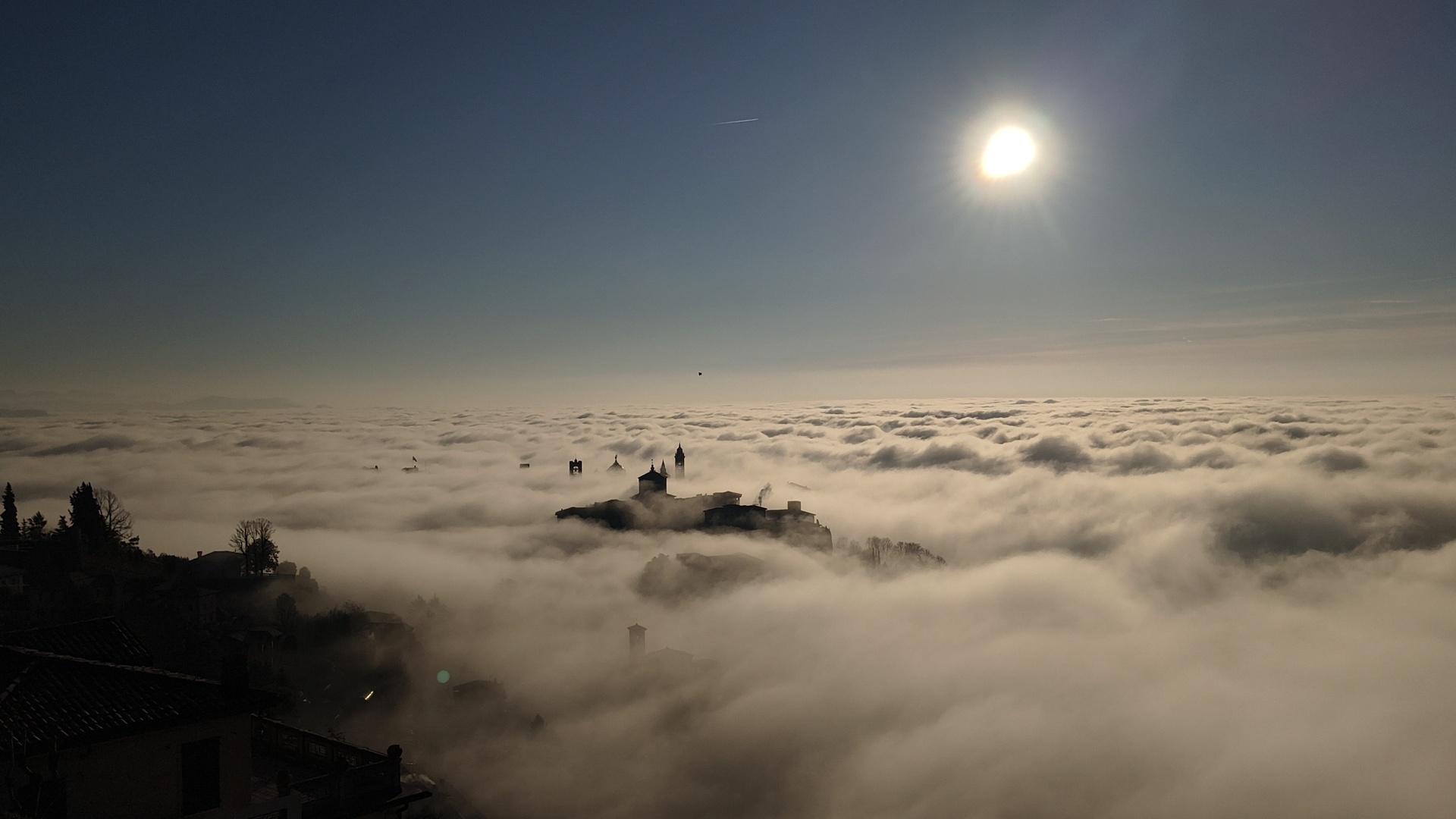 Una foto suggestiva di Città Alta, quando la nebbia ricopre tutta la pianura e il borgo storico sembra spuntare dal nulla. La spettacolare foto del giorno è di Massimo Buzzetti.