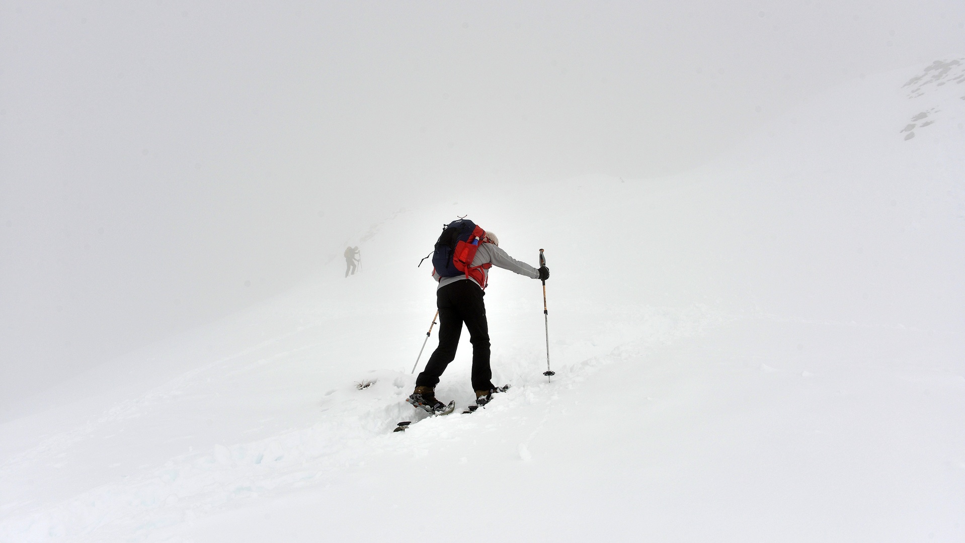 Ai piedi della Presolana verso il Bivacco Città di Clusone si sale tra le neve e la nebbia, in un’atmosfera surreale. La foto del giorno è di Roberto Roseano.