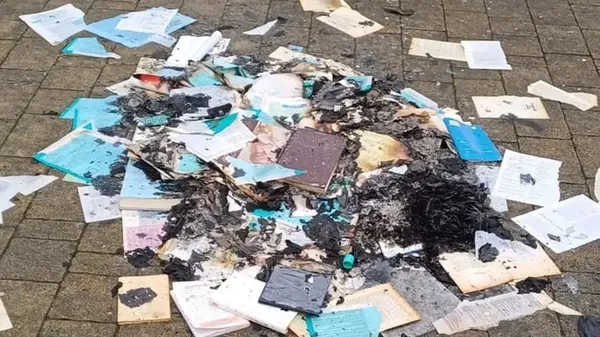 IL CASO. Nella mattinata trovato nel quartiere di Bergamo un cumulo di volumi incendiati nel giardino accanto alla chiesa.