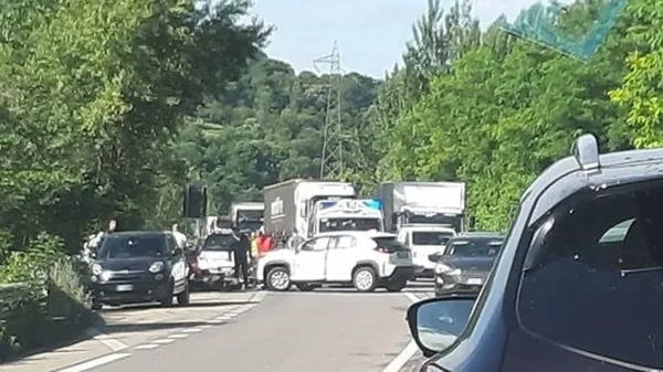 L’INCIDENTE. Traffico congestionato nella mattinata di mercoledì 12 giugno a Nembro. Lo scontro, tra una moto e un’auto, al confine tra Nembro e Albino.