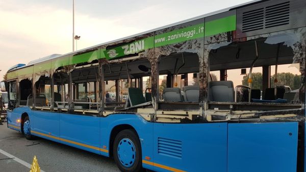 Il macchinario è fuoriuscito da un autocarro e ha urtato una betoniera e poi il pullman. In ospedale per controlli 4 studenti e 3 adulti: nessuno è grave. Accertamenti della polizia locale.