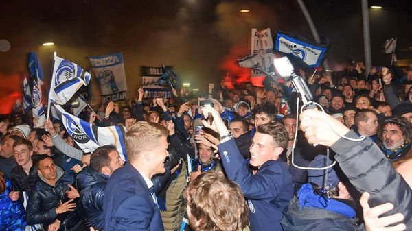 La festa dei tifosi dell’Atalanta che in migliaia hanno raggiunto il parcheggio dell’aeroporto per accogliere la squadra di ritorno da Roma dopo l’impresa dell’Olimpico.