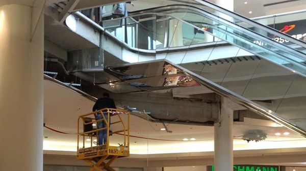 L’episodio nella mattinata di sabato 24, Vigilia di Natale, al pianterreno della struttura commerciale. Parte del cartongesso della copertura è caduto, dietro una scala mobile.