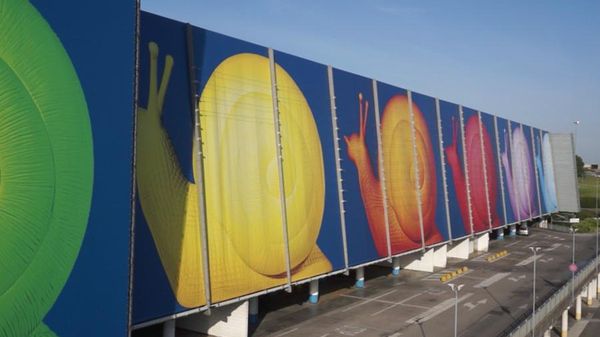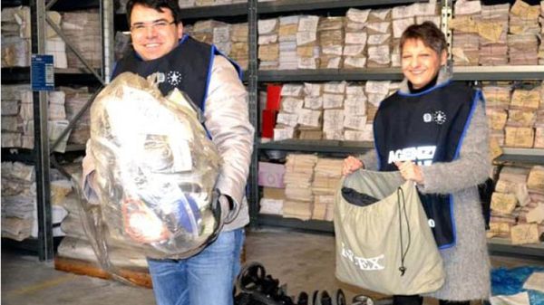 Gli enormi teli della facciata del centro commerciale di Orio al Serio si trasformano in eco-borse in materiale riciclato per solidarietà.