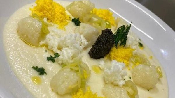 Ravioli di farina di farro ripieni di porri e patate e conditi con fonduta di taleggio