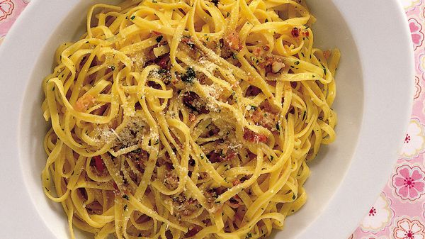 Scaldate l’acqua per le fettuccine e tritate 50 g di pancetta tesa, 50 g di cipolla e rosolate entrambe nell’olio caldo, facendo attenzione a non farlo colorire eccessivamente.