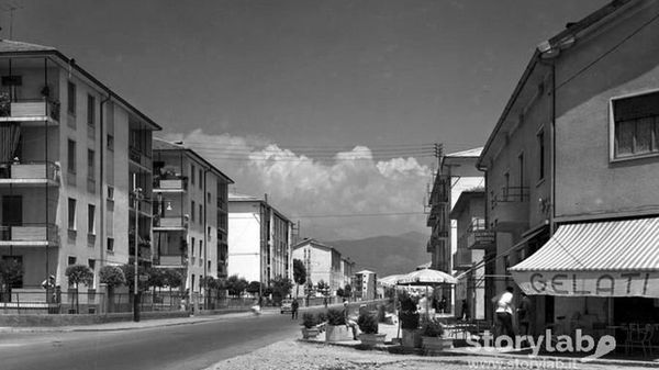 Questa fotografia ci mostra via Zambonate 55 anni fa. L’edificio nella foto, con le sue botteghe, non c’è più e la strada sulla destra è diventata un passaggio pedonale.