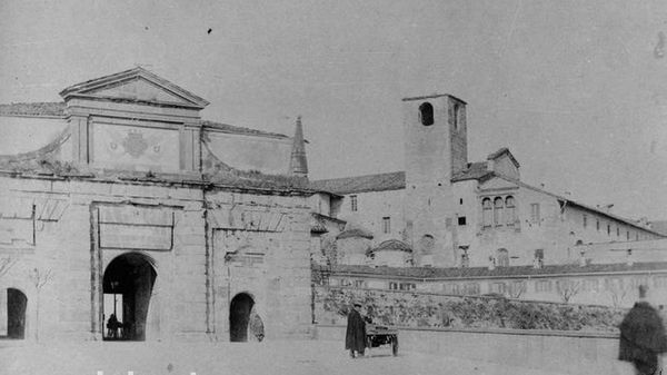 Una foto scattata nel XIX secolo ci offre lo spunto per parlare di Sant’Agostino, uno degli angoli più belli di Città Alta con la sua porta e il complesso monastico che oggi ospita l’Università.
