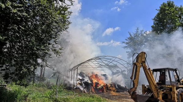 Le fiamme nel fienile dell’azienda agricola Bonacina a Carvico: i pompieri in azione dalle 12.30 per arginare il fuoco.