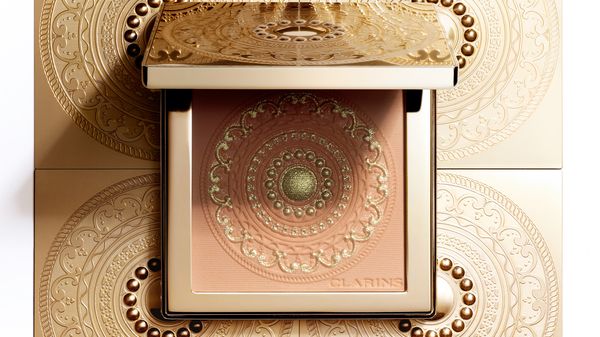 Tappa nell'Olimpo e nell'antica Grecia per il trucco delle feste firmato Clarins. La donna Odyssey sfoggia un colorito luminoso, occhi oro ramati, labbra sublimate da un caldo marrone.