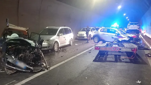 ALBINO. Scontro in galleria domenica sera sulla 671: il carrello ha invaso la corsia opposta. Tre vetture si sono poi tamponate. Ferite lievi per altri due automobilisti.